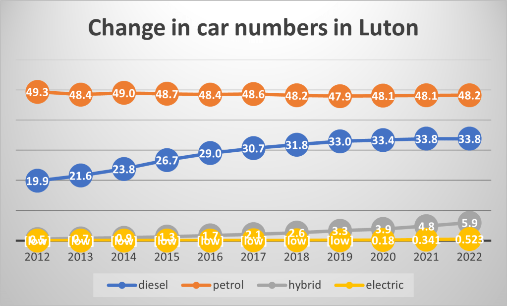 Over the last decade, the number of diesels on our roads rose from 19,900 to 33,800, and this is the source of Luton’s air pollution problem. There are now almost six thousand hybrids on the road that are making a difference, but we need a lot more electric cars before we start to see any improvement!